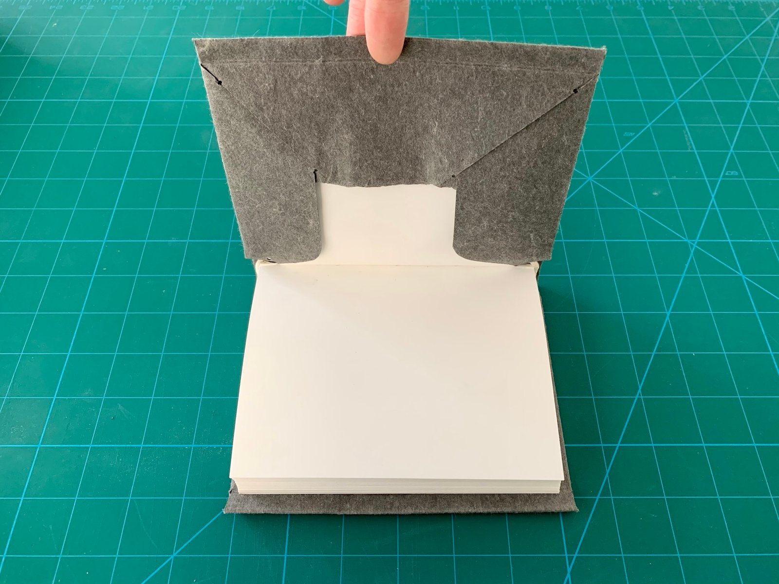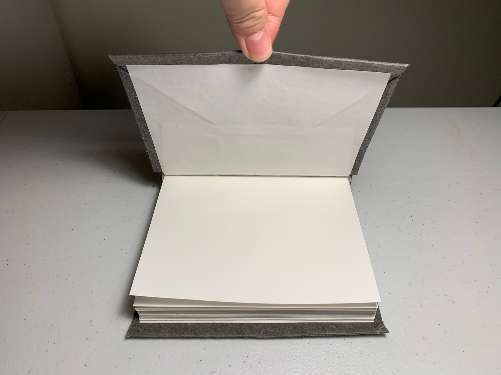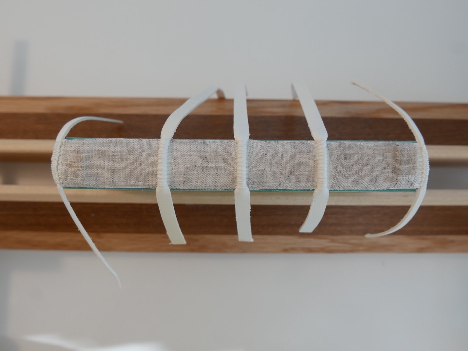 I tested several methods for attaching the endsheet: full coverage, perimeter attachment, and four-corner attachment. For the sake of time and cost, perimeter or corner attachment would have been more efficient, but full attachment is also supported by historical evidence. I preferred the full attachment, as it provided a more even surface while maintaining the structure’s flexibility.
