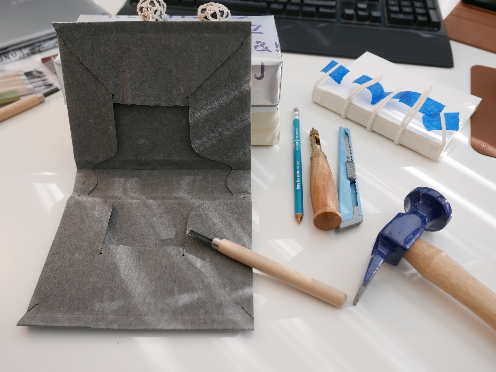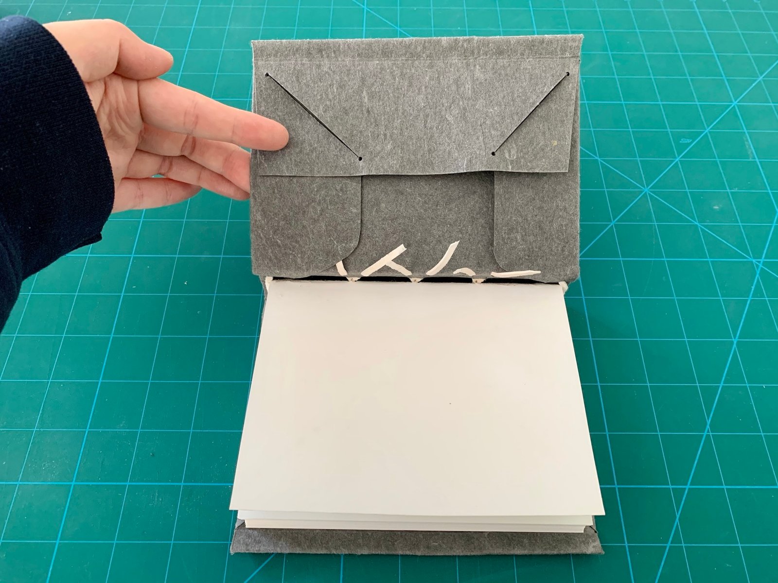 With Ann’s Zoom demonstration as a guide, I created a limp paper case model. While Pickwoad’s survey highlights a range of historical variations, some elements in my model reflect modern modifications, such as the way the turn-ins are folded at the corners, the Yapp edge, and the use of a Japanese hole puncher. Ann’s approach to endsheets involved inserting the half of the first gathering under the turn-ins, but I also wanted to experiment with a pastedown method. My main concern was how the paper case would react to adhesive when attaching the pastedown sheet.