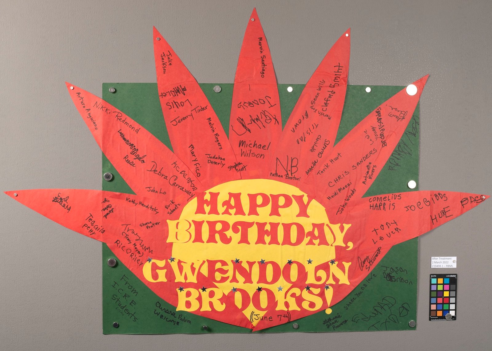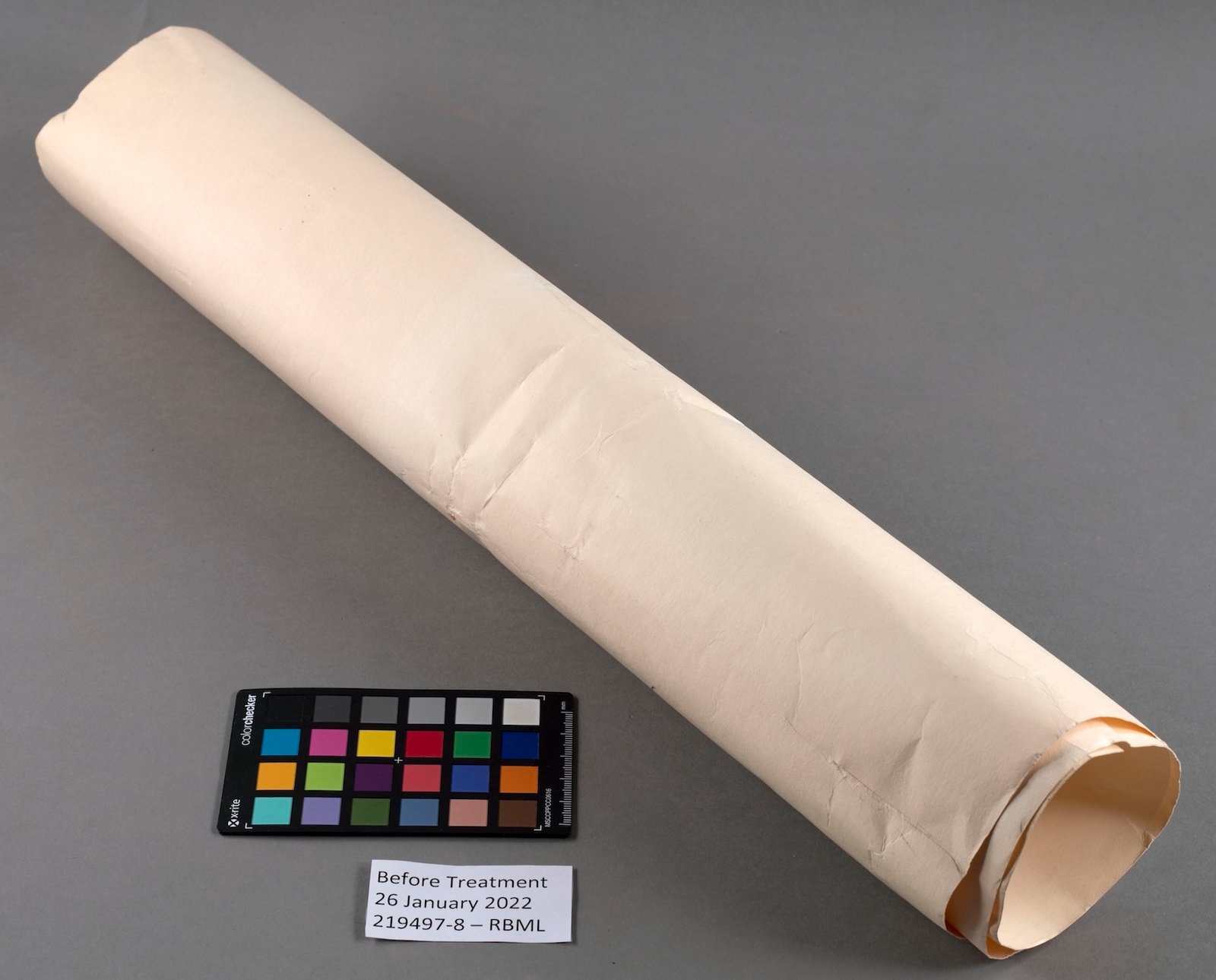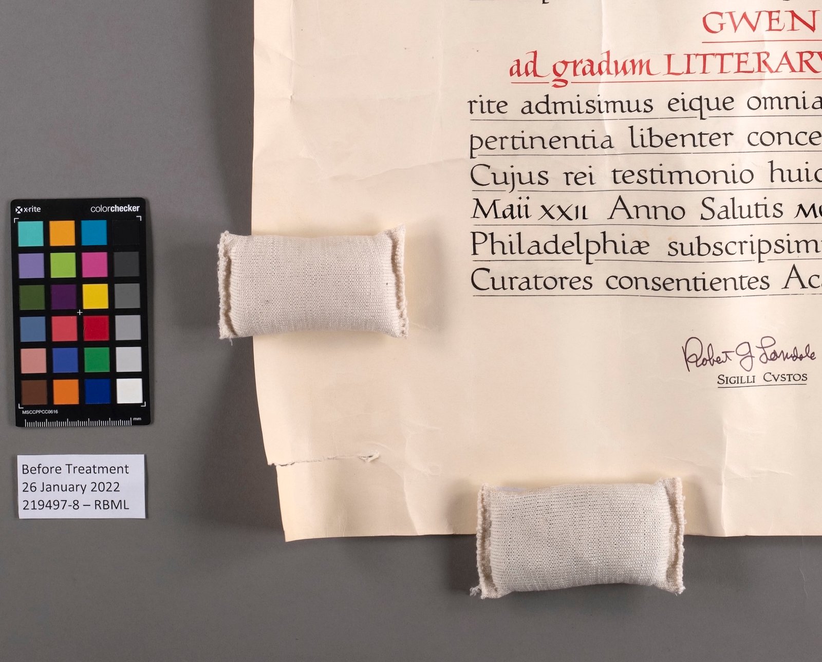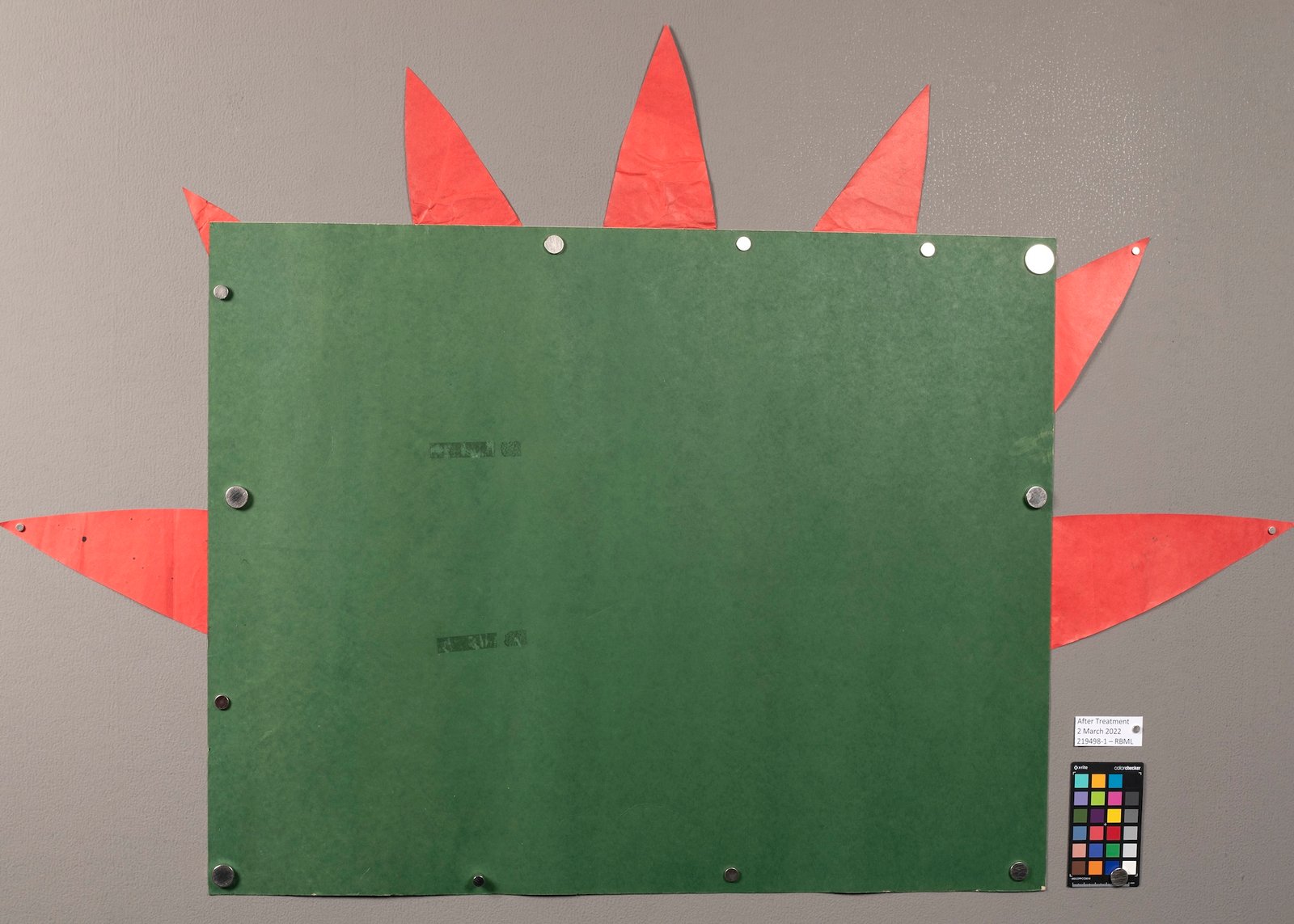 The collection included boxes of rolled posters, documents, honorary degrees, handmade collages, and cards. To ensure safer and more accessible storage, all rolled items were flattened. Humidification was performed in a humidification chamber, followed by flattening and drying in a blotter-and-felt stack. Minor tear mending, tape removal, and reattachment of loose pieces were carried out on select items. All materials were rehoused in Mylar sleeves and/or archival folders for long-term preservation.