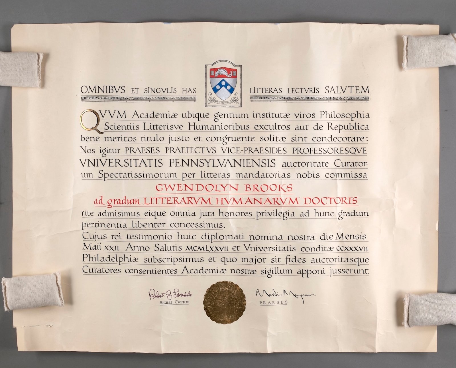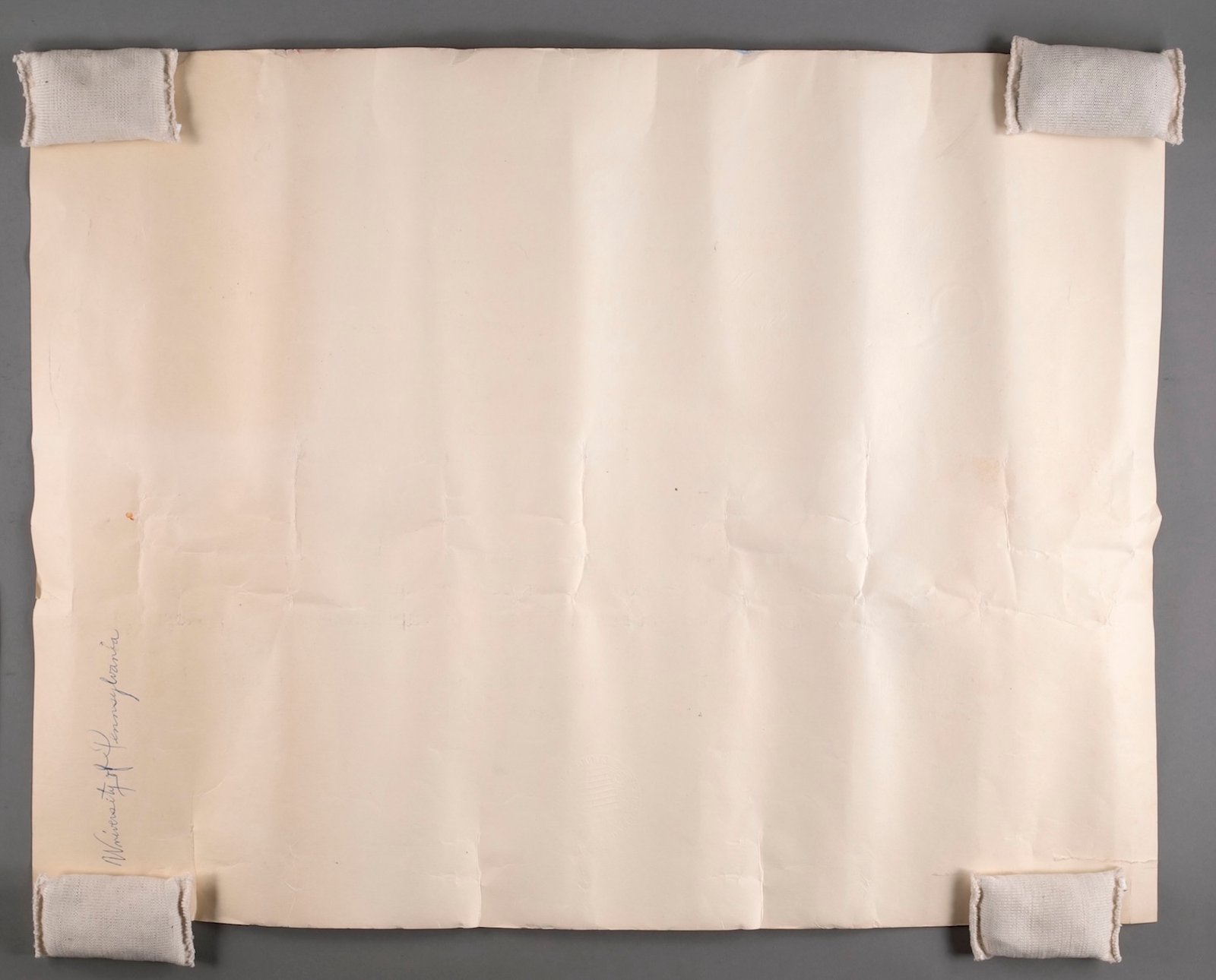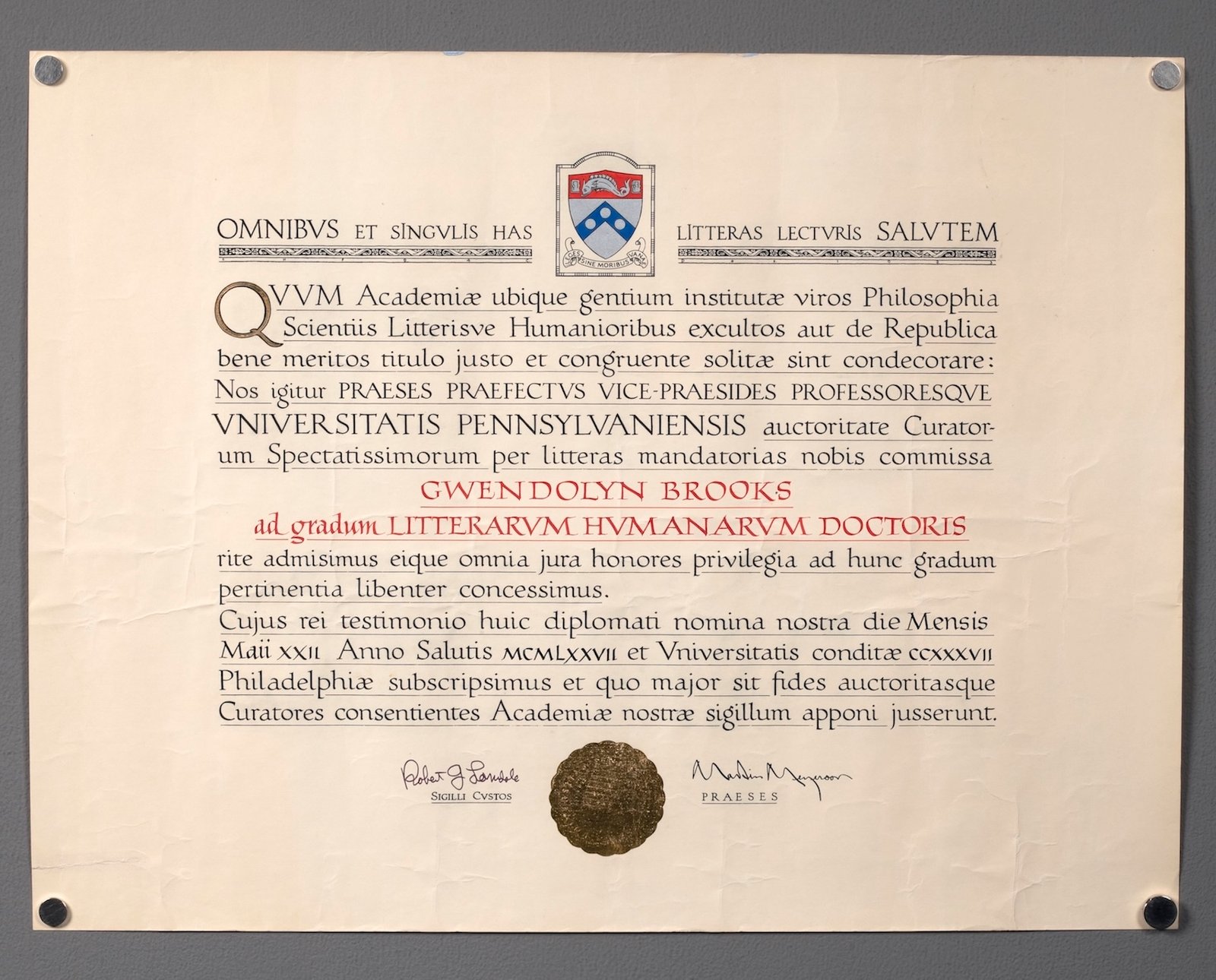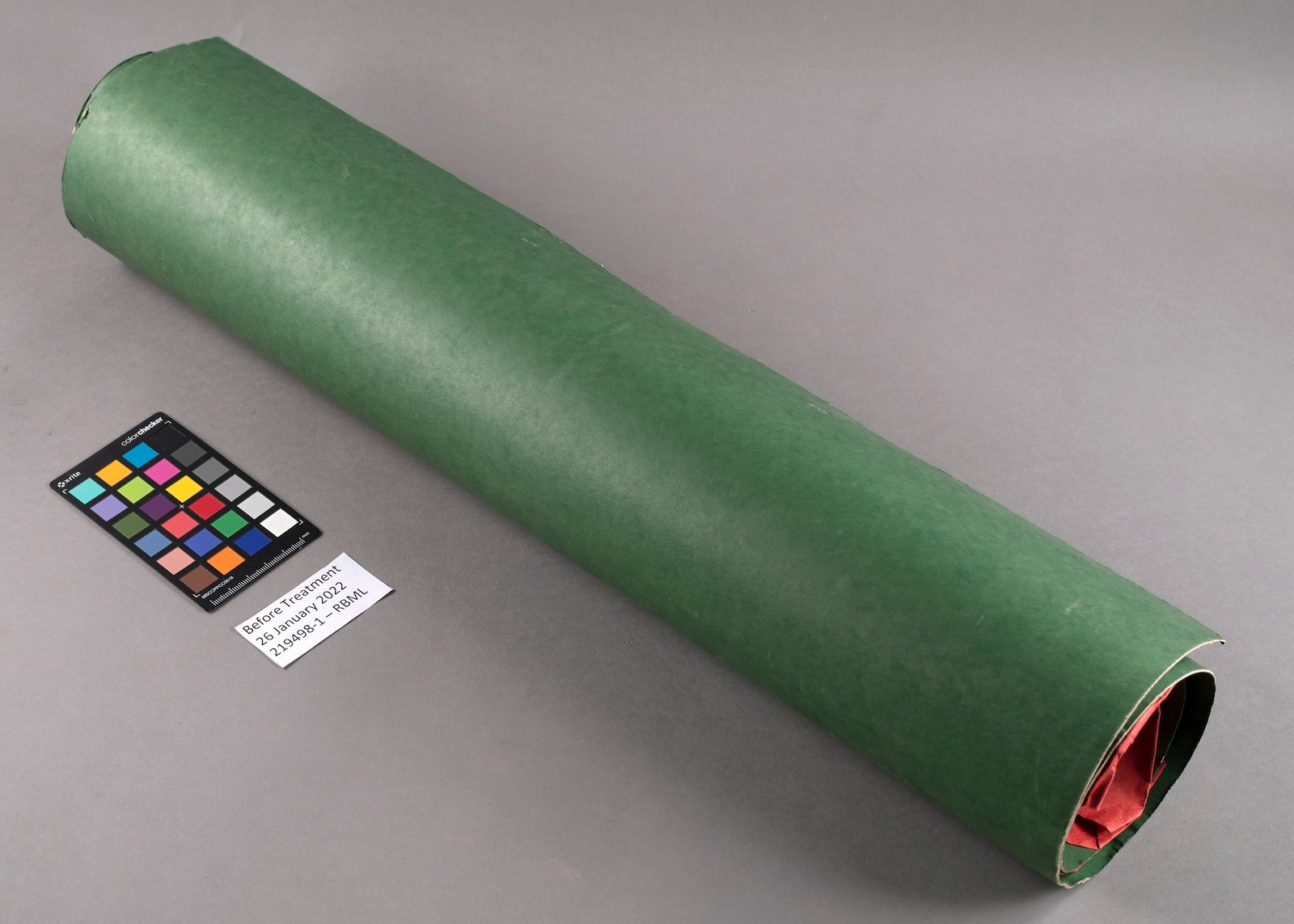 The collection included boxes of rolled posters, documents, honorary degrees, handmade collages, and cards. To ensure safer and more accessible storage, all rolled items were flattened. Humidification was performed in a humidification chamber, followed by flattening and drying in a blotter-and-felt stack. Minor tear mending, tape removal, and reattachment of loose pieces were carried out on select items. All materials were rehoused in Mylar sleeves and/or archival folders for long-term preservation.