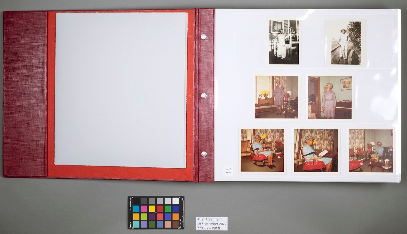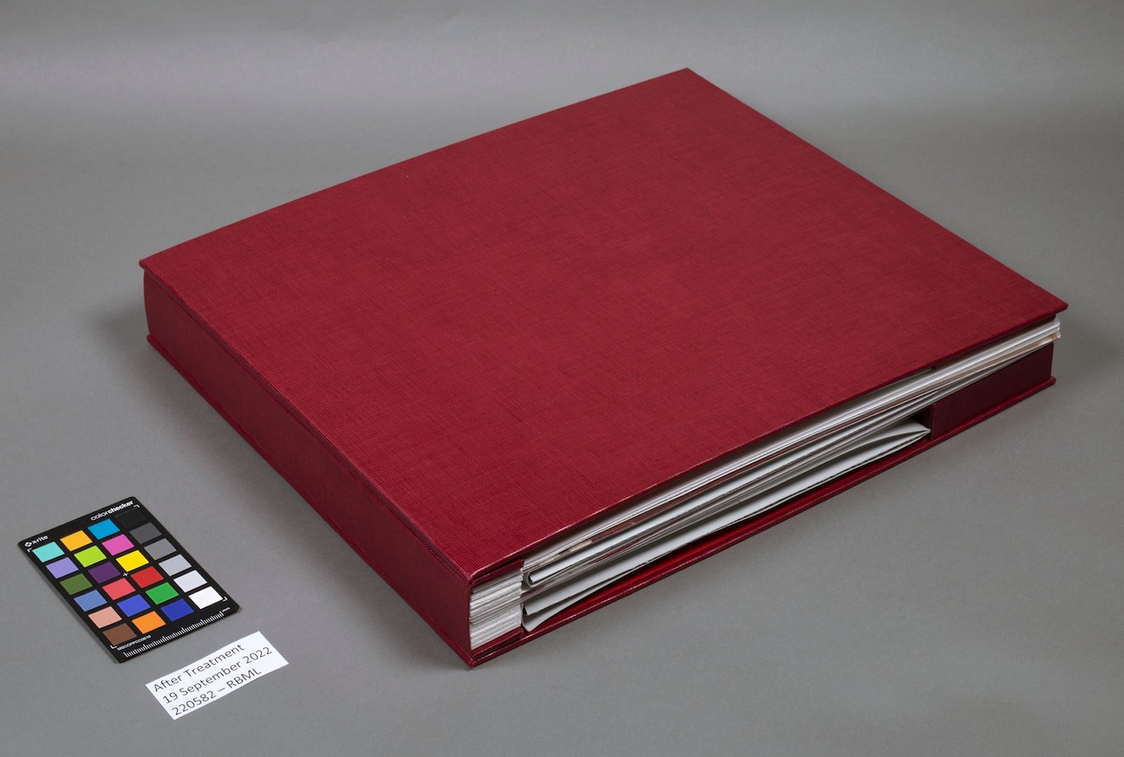 The album treatment started with recording the order of the album materials. The photos were encapsulated in 3 mil mylar sheets, maintaining the original arrangement and orientation, with overflow photos placed in foldout. Pages were divided into recto and verso leaves to preserve written information on the backs of the photos. White Permalife paper was inserted between the leaves for clarity, and surrogates were used for the backing papers that have inscriptions. Tucked-in materials were rehoused in mylar sleeves with labels individually, in four-flap wrappers together. The new album leaves were hole-punched, and strips of blotters were added as spacers to accommodate the thickness. A spine piece was created with 20pt. cardstock and red bookcloth, and the covers were constructed with binder’s boards and red bookcloth, using metal posts for binding. A custom-fitted box was made from corrugated boards to house the original and new bindings.