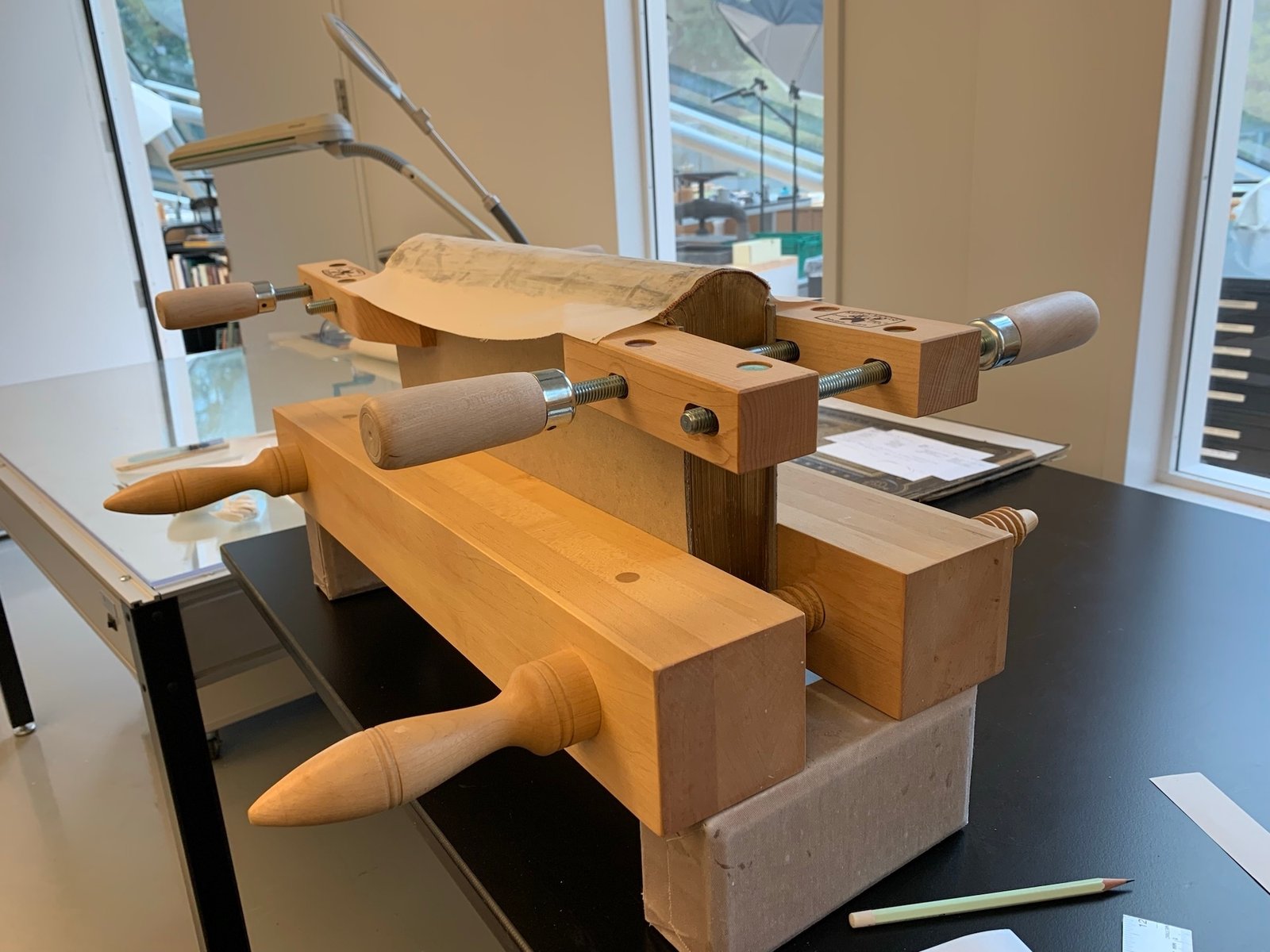The main challenge of this treatment was the book’s substantial weight (22 lb). The repair required materials strong enough to support the heavy boards and textblock. Airplane cotton was chosen for the reback due to its strength and thinness, while Lascaux 498 HV was used to attach the textblock to the case to ensure strong adhesion between the textile and paper spine linings.