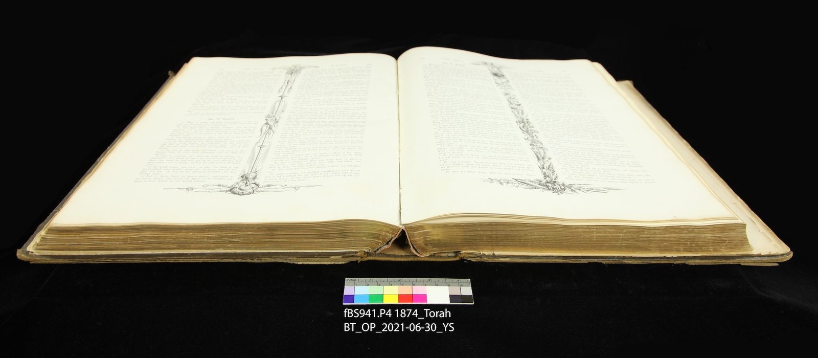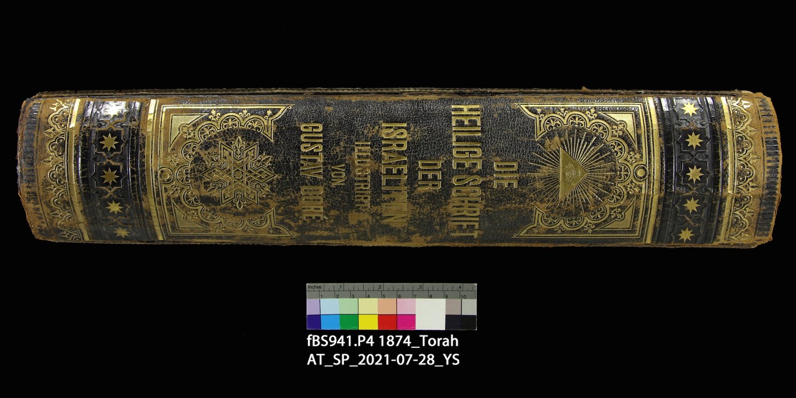 This Hebrew Bible is an in-boards binding with a leather spine and cloth-covered boards. The front cover and spine are elaborately decorated with pressed and raised designs, including a gold title. The back cover has the same raised design but lacks gold decoration. Both the leather and cloth coverings are dark brown with a similar pebbly surface texture, creating a consistent appearance throughout. The case has a hollow back with an almost tight joint. While large, heavy Bibles like this are common in collections, this volume features a unique case structure. The case is constructed in a split-board style, with the boards made of three layers, and the five cord slips laced through the innermost binder’s board (see diagram in “DURING TREATMENT” photos for details).