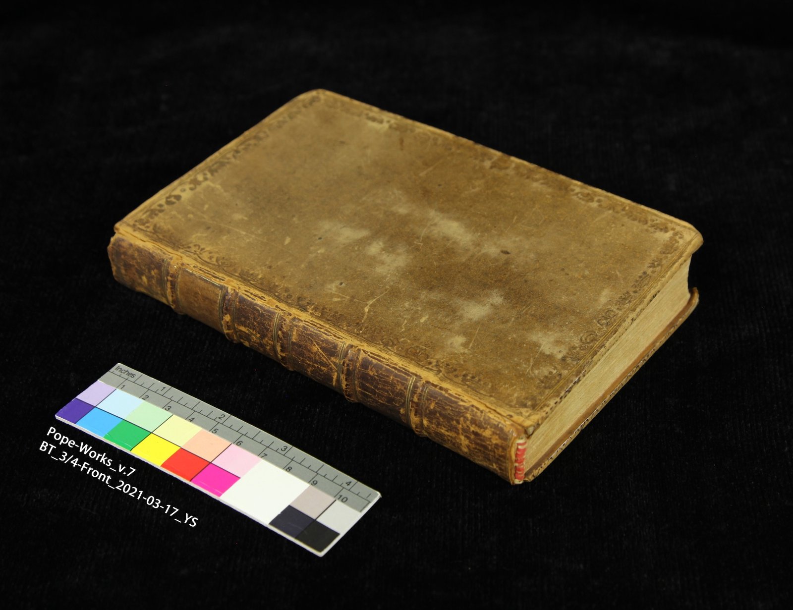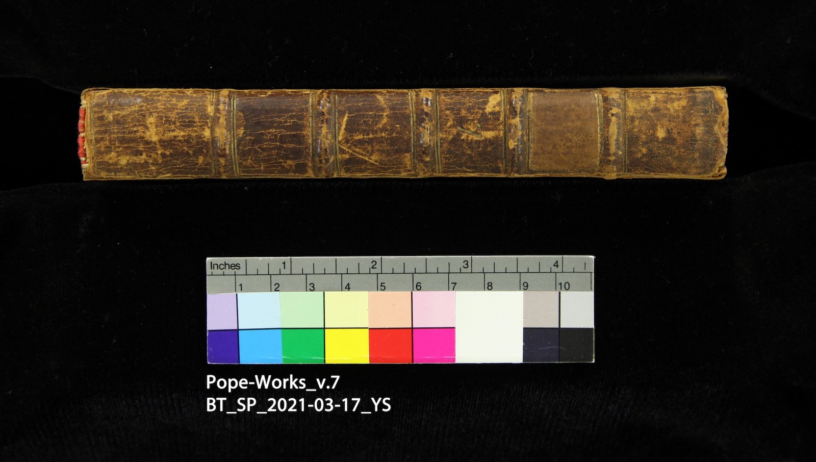 The book is generally in good condition. The leather cover shows mild red rot and partial splitting along the outer joints. The endcaps are missing, exposing the endbands. The red thread of the tailband is broken into pieces. The endpapers are stained from the acidic leather, and the textblock shows sporadic foxing and general grime.
